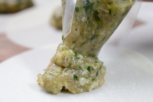 地鶏のもも挽肉と鶏油・鶏皮をベースにニラとキャベツのみじん切り、オイスターソース・ごま油などと合わせて使いやすい絞出し袋に入れました。